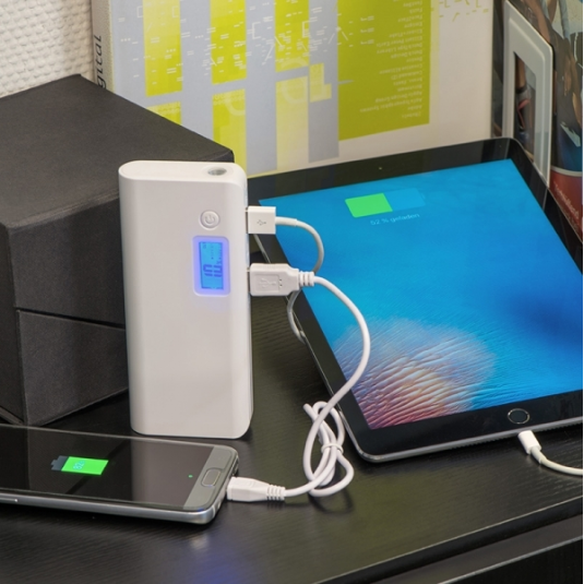 - Power bank o pojemności 10 000 mAh, wykonany z plastiku.